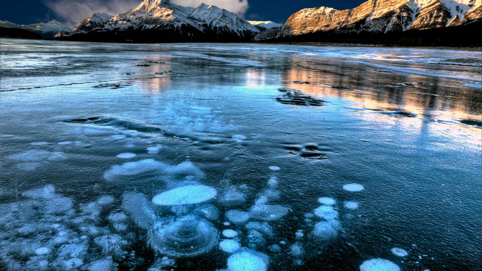 Abraham Lake in Canada is a stunningly beautiful lake in the Canadian Rockies. Its crystal-clear waters are surrounded by snow-capped peaks, making it an amazing site. Also, its freezing temperatures make some incredible ice formations and bubbles you can see when the lake thaws in springtime.